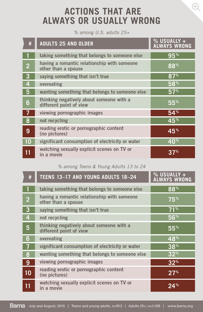 Fifth, the third item in each list is lying. But among the younger generation the percentage who think it is wrong has dropped by 16 points. Lying is still considered a moral failure, but by fewer and fewer people. Almost 3 out of every 10 folks under 24 think it is fine to lie. This disturbs me almost as much as the porn statistic.